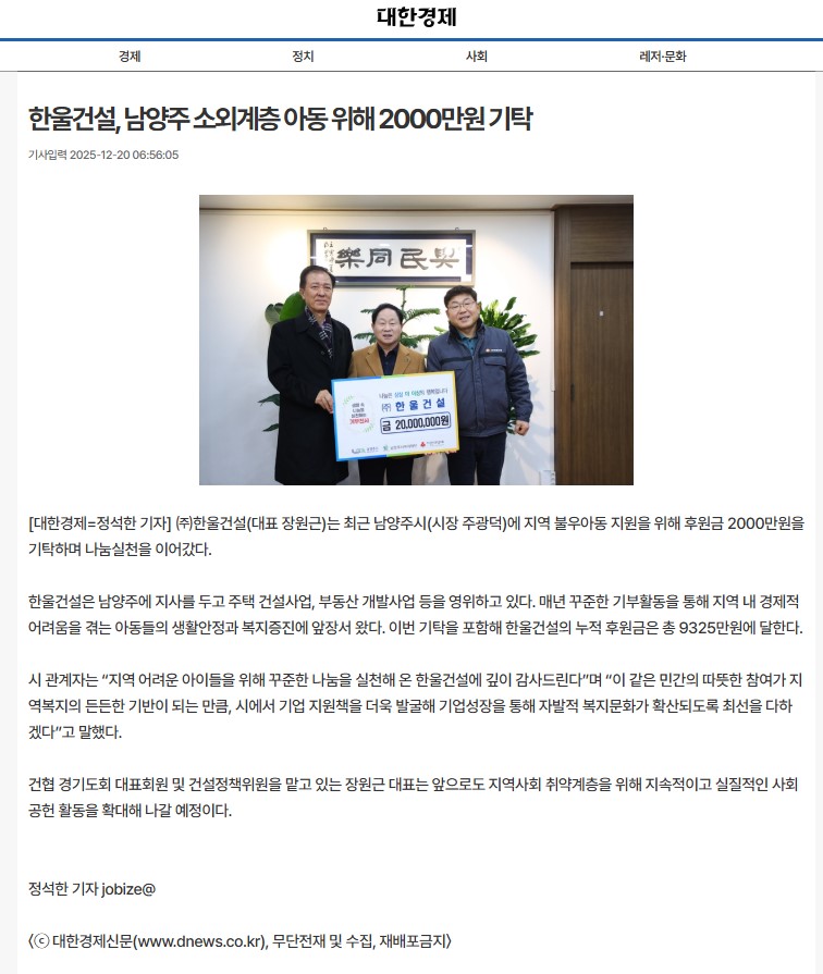 당사는 앞으로도 건실하고 정직한 기업으로 나아가며 취약계층 지원과 지역사회 발전을 위해 최선을 다할 것을 약속드립니다.